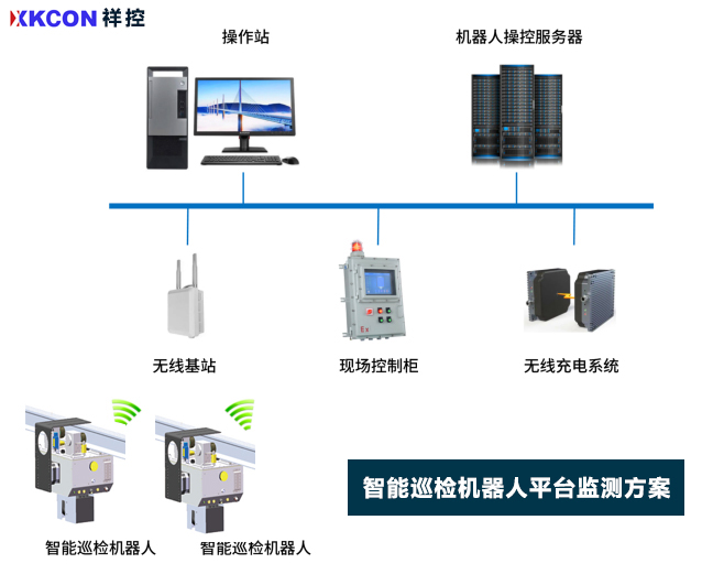 我司研制的XKCON祥控掛軌式智能巡檢機器人在線監測系統由行走軌道、機器人本體、無線通訊基站、巡檢設備、現場控制柜以及遠程操控平臺等部分組成,集機械、電子、計算機、移動通訊、智能機器人、防爆等技術于一體。