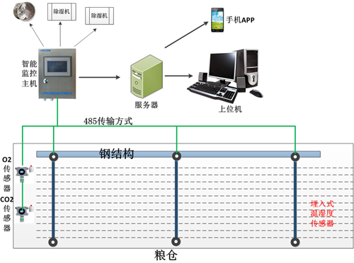 系統組成:在線式氣體濃度檢測儀(一氧化碳、氧氣)、在線式溫濕度檢測儀、鎧裝式測溫線纜、糧倉環(huán)境安全智能主控柜、上位機電腦。