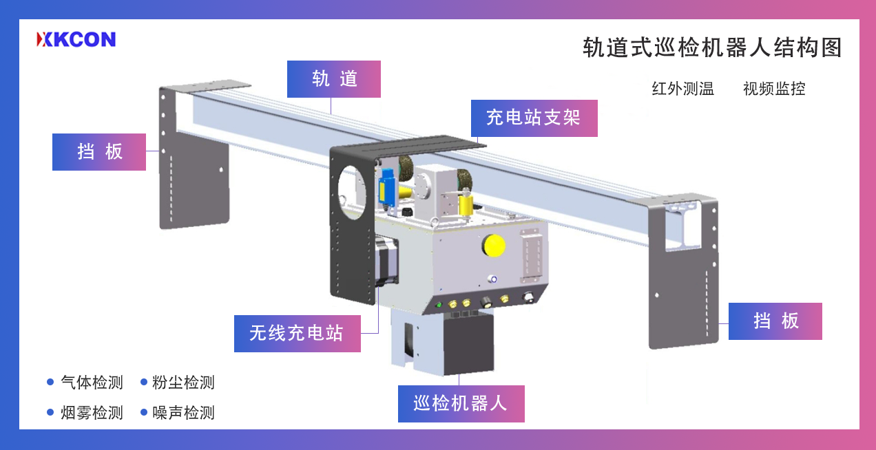 我司研制的XKCON祥控掛軌式智能巡檢機器人XKCON-RTI-001由巡檢機器人本體、軌道、無線充電站等組成,實現連續不間斷的巡視巡檢作業,是一個通過智能機器人對廠區內設備狀態進行自動化巡檢的解決方案。