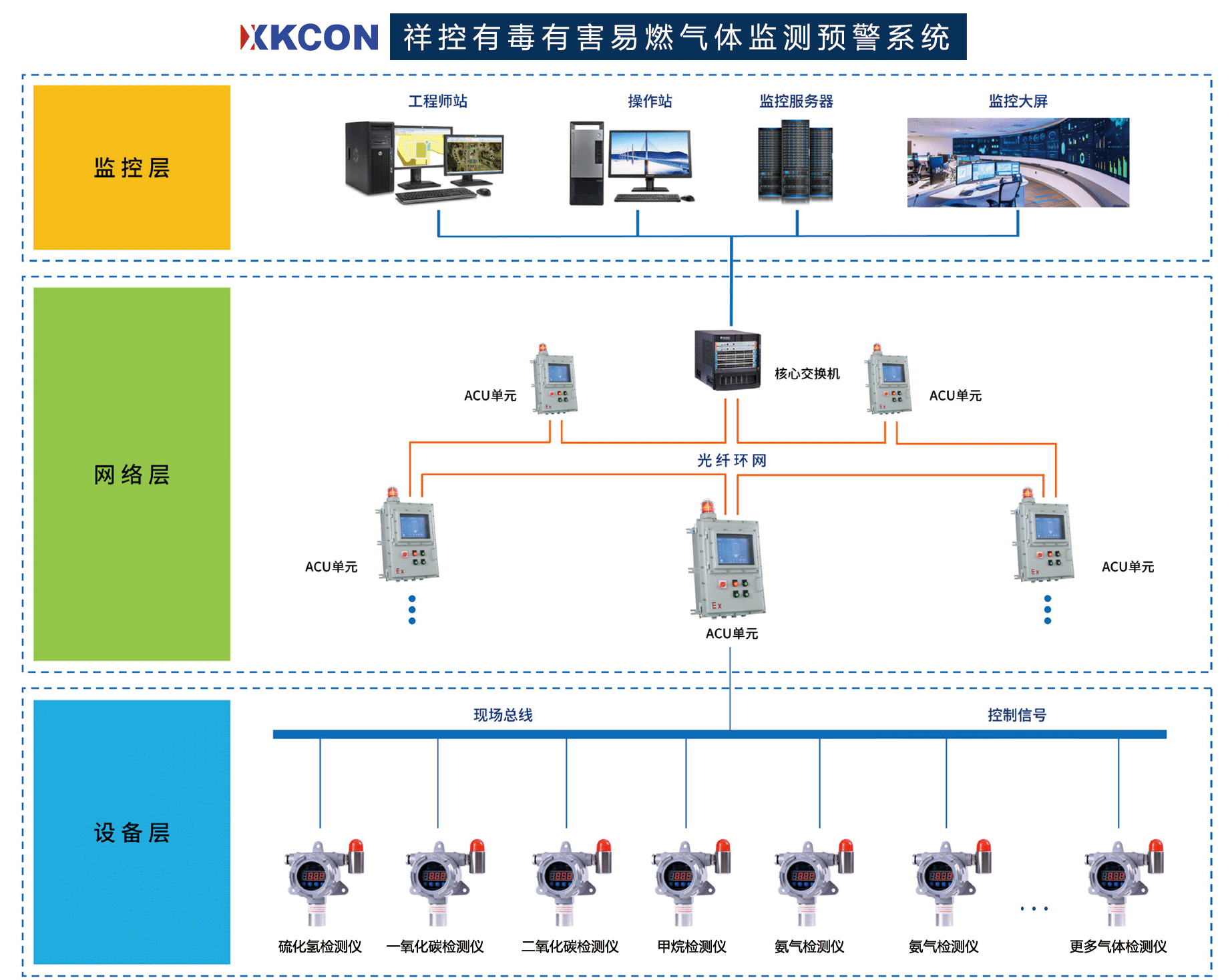 XKCON祥控化工園區(qū)有毒有害易燃?xì)怏w監(jiān)測(cè)預(yù)警系統(tǒng)包括數(shù)據(jù)采集層、智能控制層和網(wǎng)絡(luò)預(yù)警平臺(tái)組成。