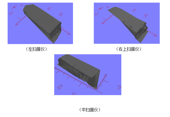通過3臺不同點位安裝的掃描儀對一已知體積的煤堆進行掃描,各自掃描數據計算建模后如下: