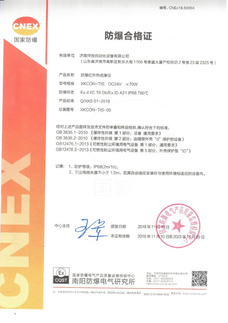 XKCON-TIS系列防爆監控測溫型紅外熱成像儀滿足GB 3836.1-2010 《爆炸性環境 第1部分:設備 通用要求》、GB12476.1-2013 《可燃性粉塵環境用電氣設備 第1部分:通用要求》,適用于具有ⅡA、ⅡB、ⅡC類可燃性氣體,引燃溫度組別為T1-T6組的1區、2區,可燃性氣體或蒸氣與空氣形成的爆炸性混合物的場所,也適用于引燃溫度組別為T1-T6組的20區、21區、22區,含有可燃性粉塵混合物的場所。如:石油、化工、礦井、軍工、醫藥、油庫、輪船、鉆井平臺、加油站、花炮生產、糧食加工儲存等。