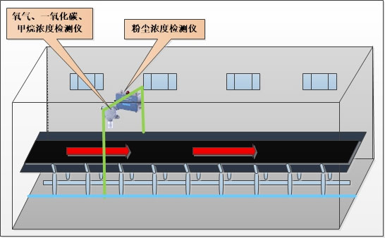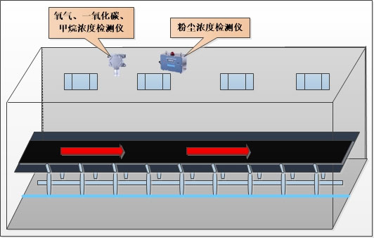 本系統設備主要包括:粉塵濃度檢測儀、氧氣濃度檢測儀、一氧化碳濃度檢測儀和甲烷濃度檢測儀,分別檢測通廊內檢測區域內環境中的粉塵濃度、氧氣濃度、一氧化碳濃度以及甲烷濃度,并設定安全閾值,超限報警,確保通廊內工作人員的人身安全以及保障設備正常運作。