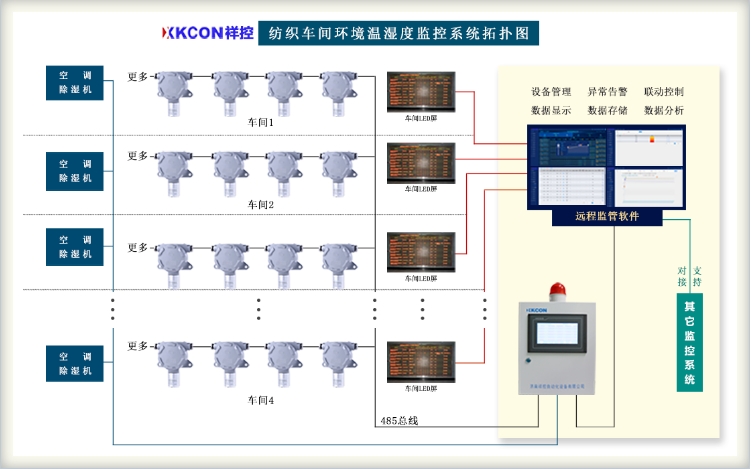 可控制各紡織車間現場LED屏實時顯示車間環境溫度和相對濕度的當前數值;支持視頻監控、煙感、消防、門禁等進行集中監控管理。